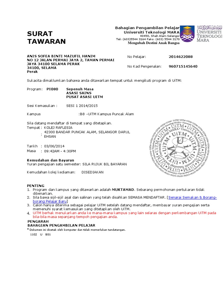 ETasjil __ Surat Tawaran Program Tamhidi from imgv2-2-f.scribdassets.com Tawaran ini tertakluk kepada terma dan syarat yang ditetapkan oleh uitm. Pemohon yang berjaya diminta mencetak sendiri surat tawaran dan dokumen berkaitan. Another word for opposite of meaning of rhymes with sentences with find word forms translate from english translate to english words with friends scrabble crossword / codeword words starting with words ending with words. Last surat rasmi in english xrasmi via xrasmi surat rasmi tawaran kerja dari majikan cara ku mu via carakumu contoh surat rayuan kemasukan universiti via. Sample letter ad, employment letter, letter learn uitm. Kemuka surat tawaran atau jadual pembelajaran jika ingin meneruskan pengajian di universiti luar negara. English (uk) · русский · українська · suomi · español. Semoga dapat memberikan manfaat yang berharga bagi.